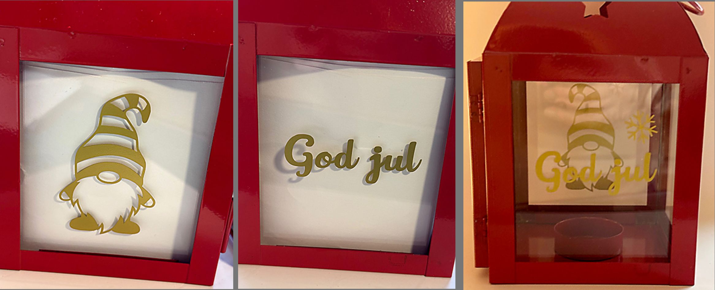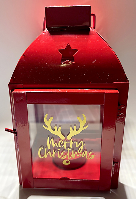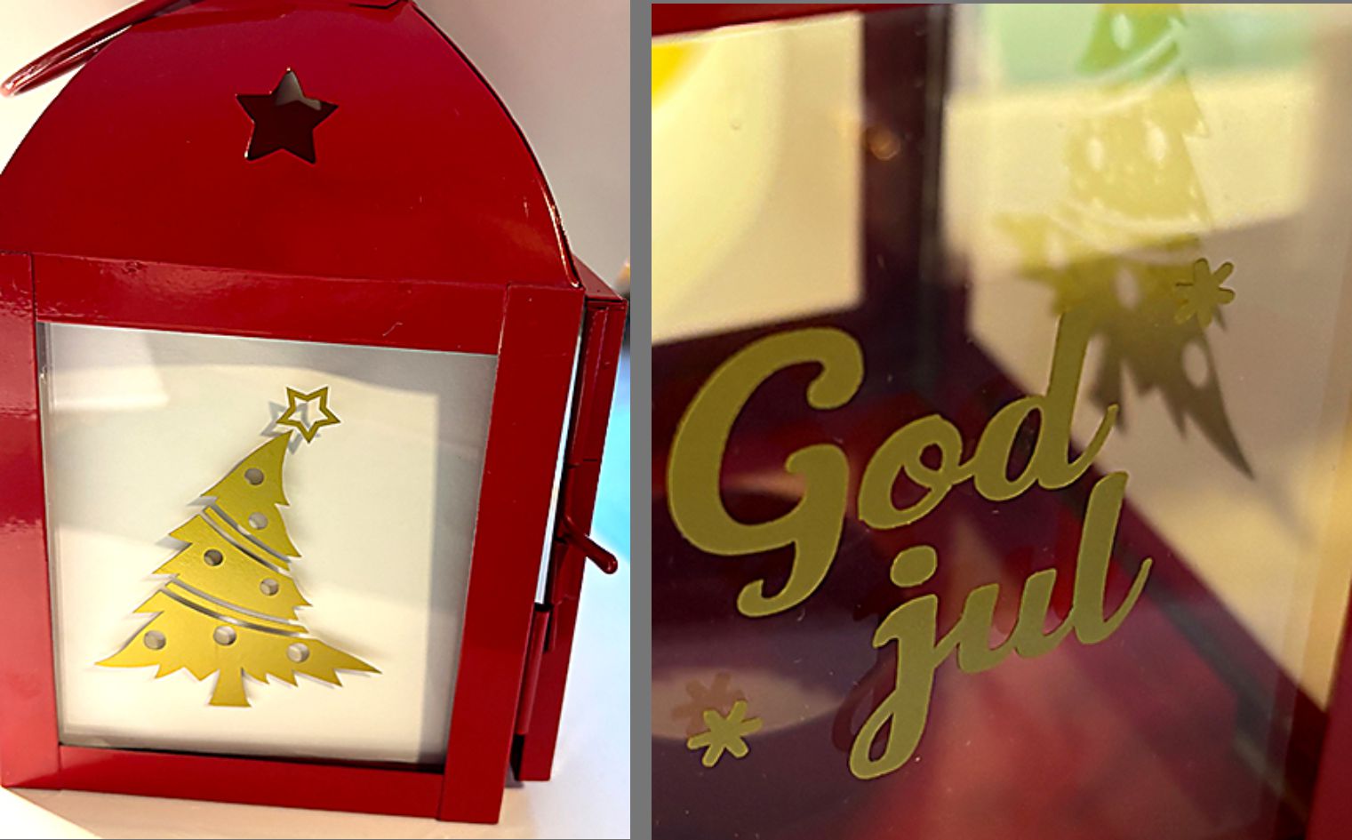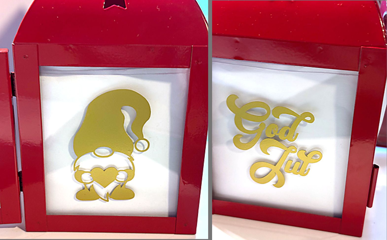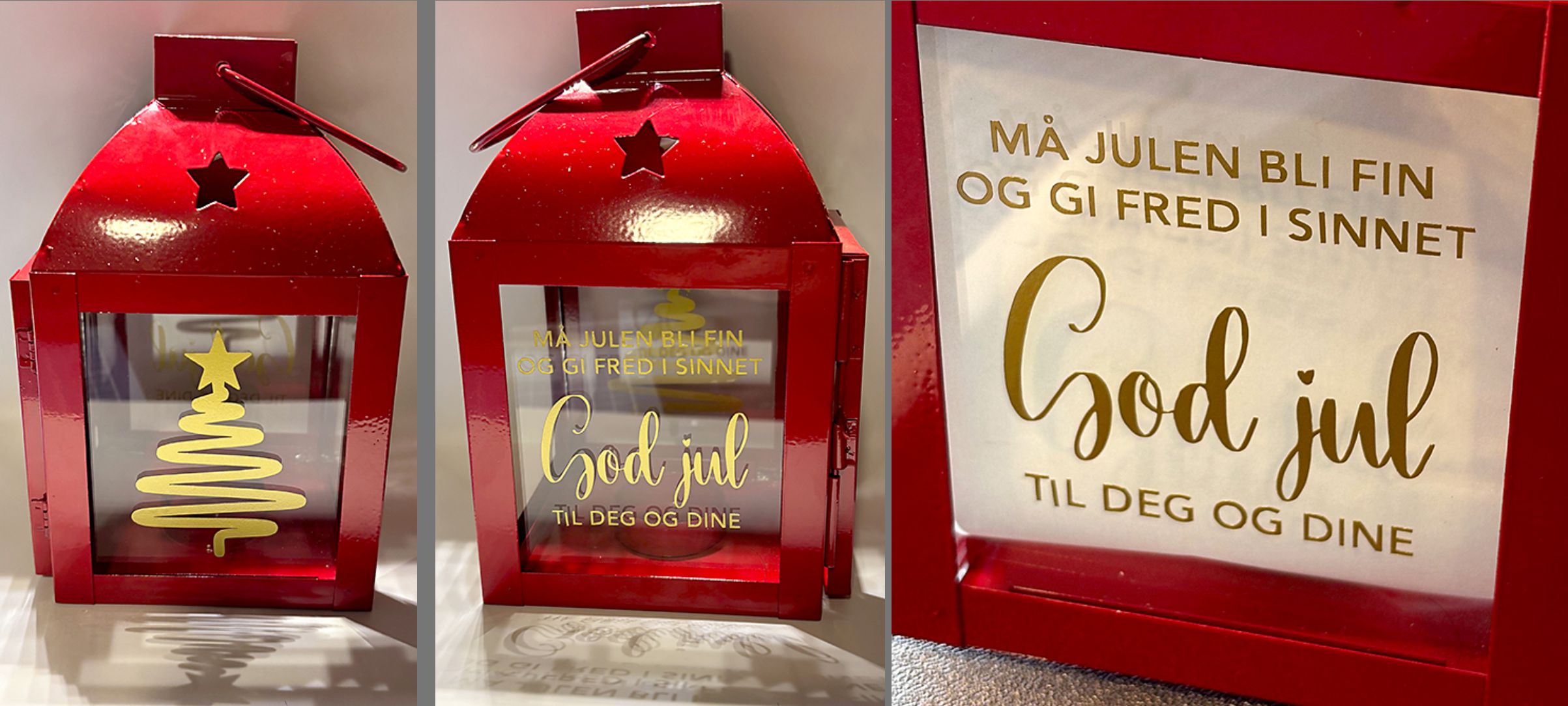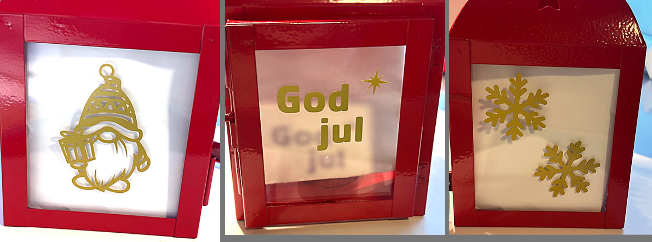Man får fort julestemning med denne kjempefine lykten i rødmalt jern med klart glass, dekorert med julemotiv i gullfolie, og stjerner på toppen. Den er håndlaget og er 17 cm høyd, 10 cm bred og 10 cm dyp.