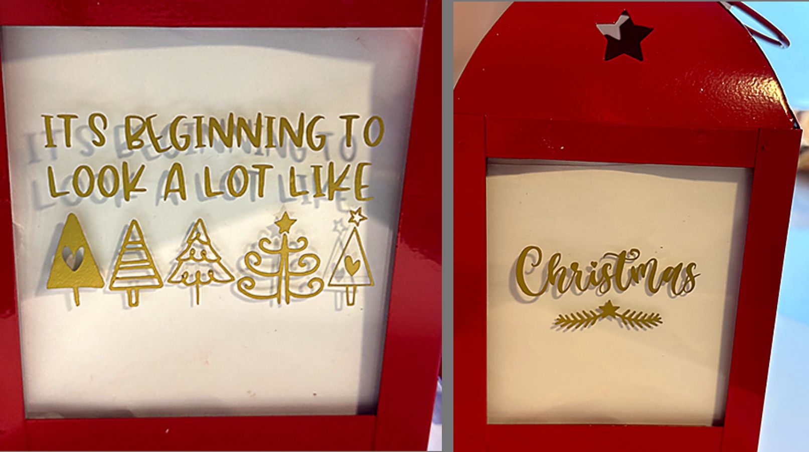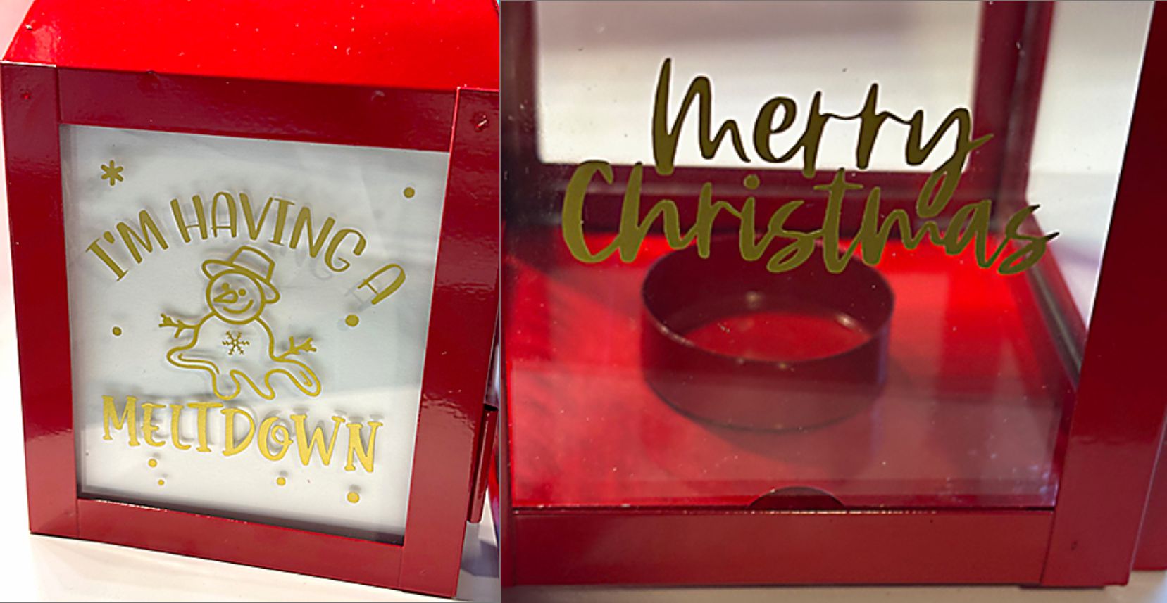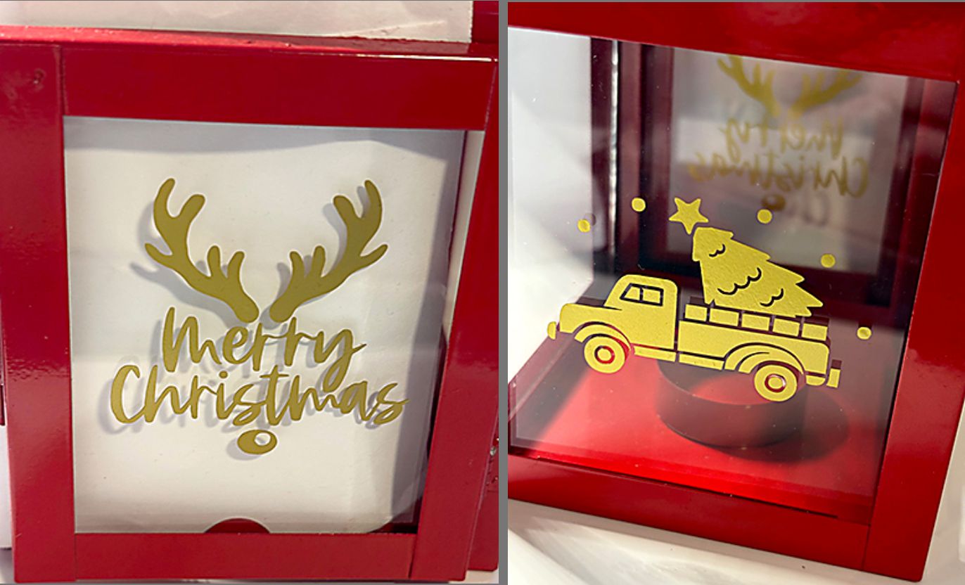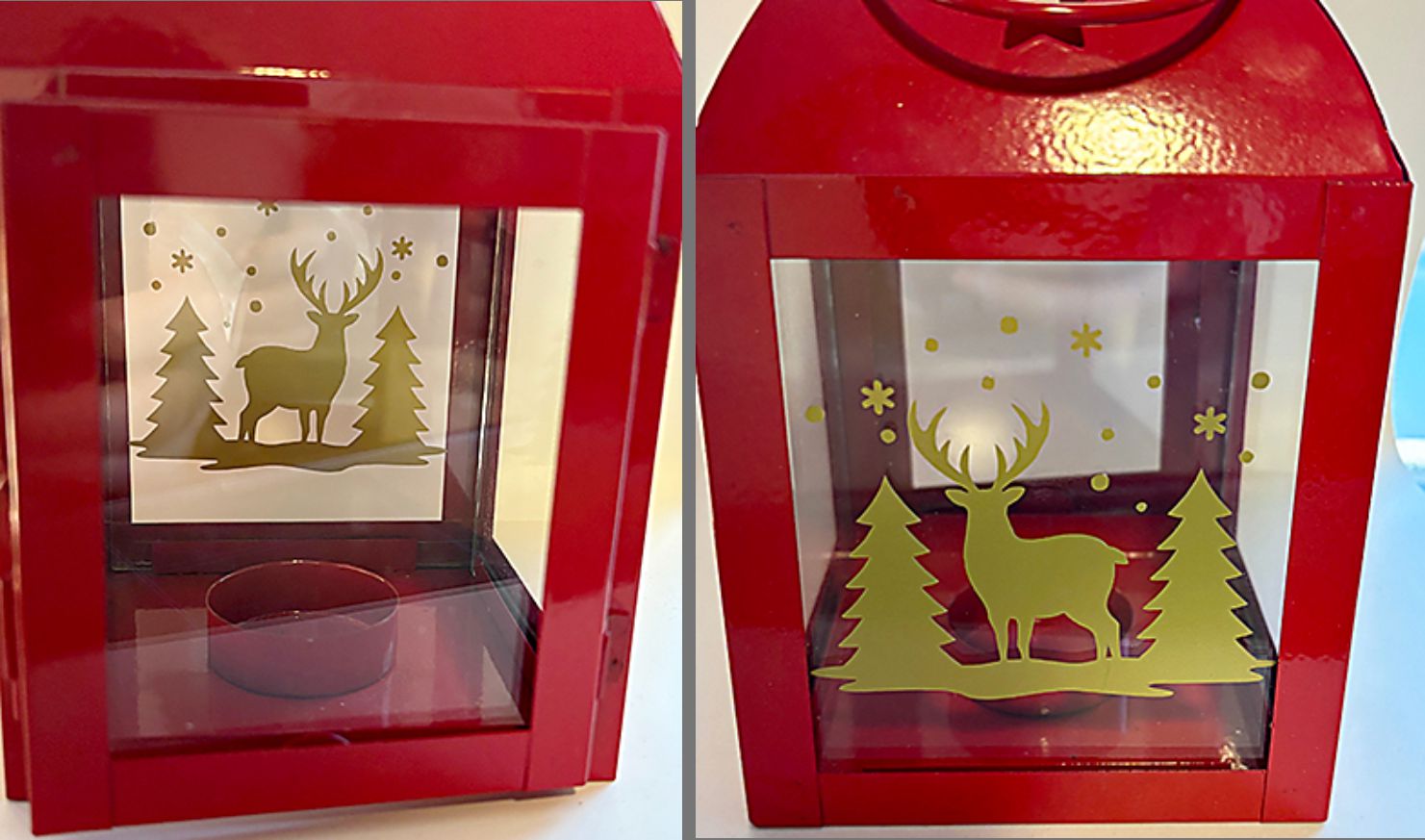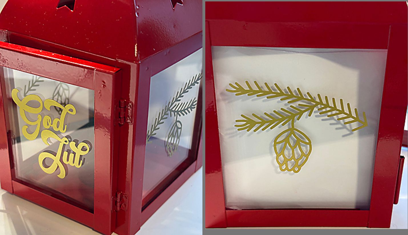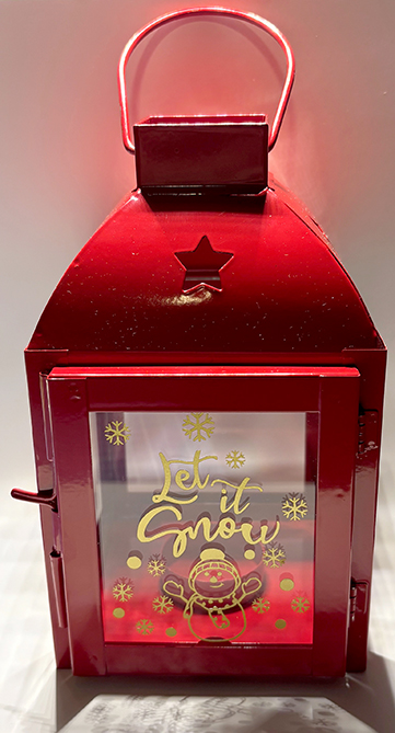 Man får fort julestemning med denne kjempefine lykten i rødmalt jern med klart glass, dekorert med julemotiv i gullfolie, og stjerner på toppen. Den er håndlaget og er 17 cm høyd, 10 cm bred og 10 cm dyp.