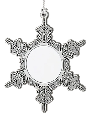 Nydelig juleornament i metall, hvor du kan få trykket ønsket bilde på den runde platen. Bildet blir ca 2,9 cm i diameter. Snøfnugget er ca 7,5 cm.